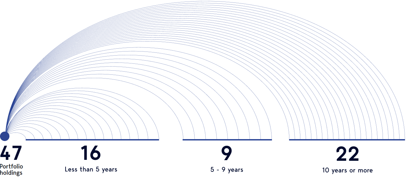 When we say we invest for the long term, we mean decades. One of our founders expressed a strongly held view that continues to represent the essence of our investment philosophy today: compound growth x time = investment nirvana. So, nearly half the stocks we hold in a typical global portfolio have been held for more than a decade.